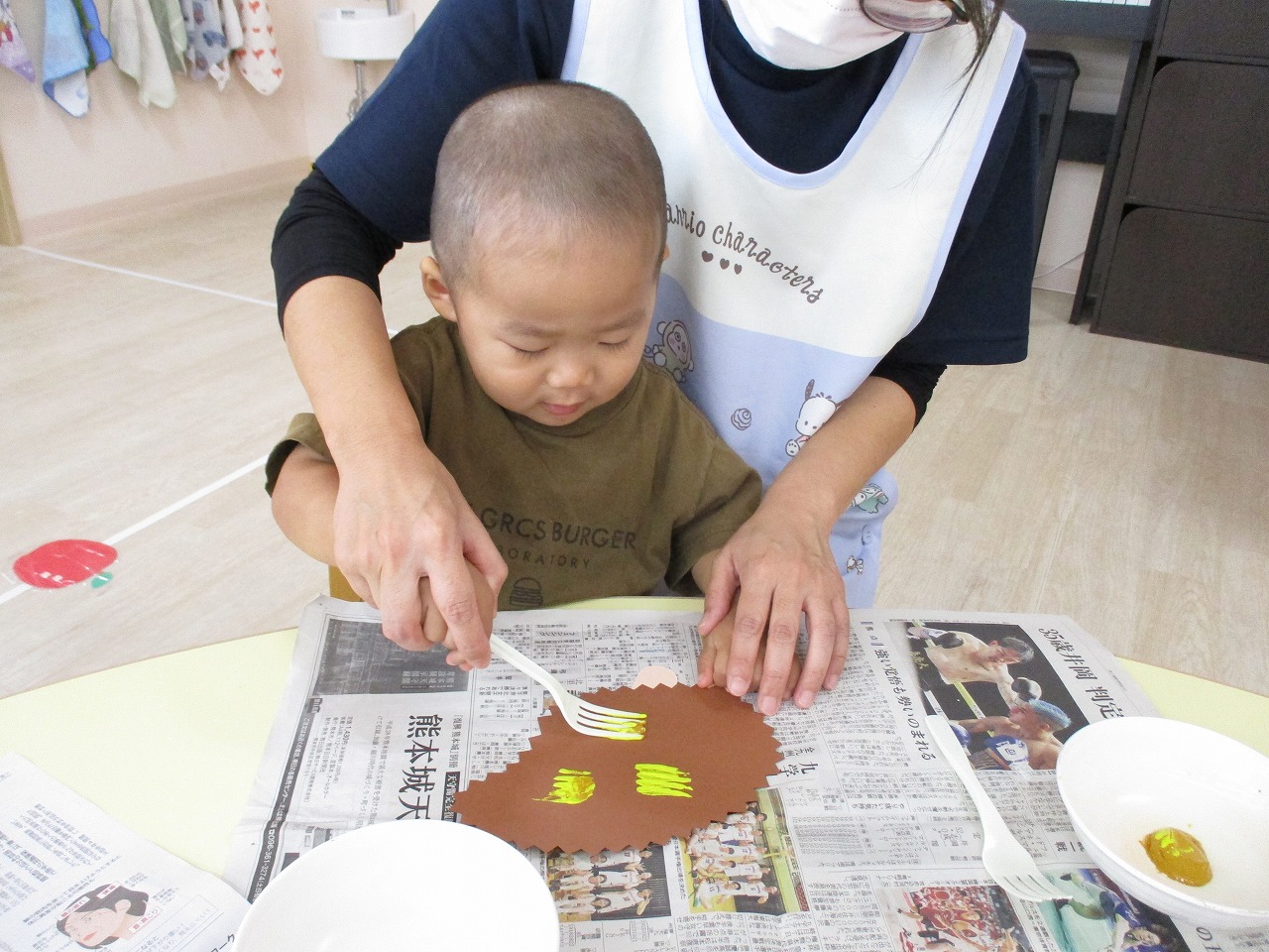 フォークに絵の具を付けてペタペタ、スタンプをしました!