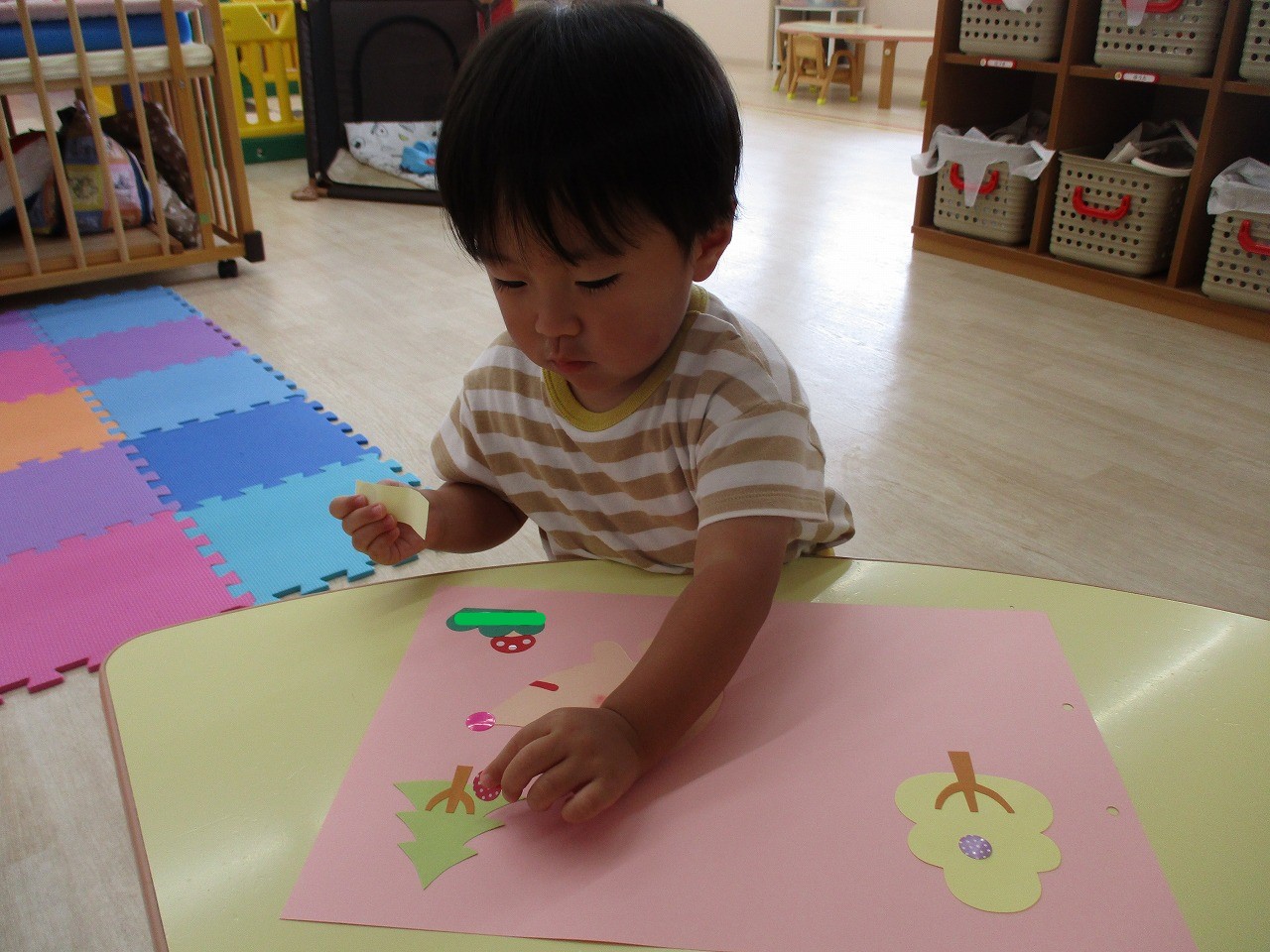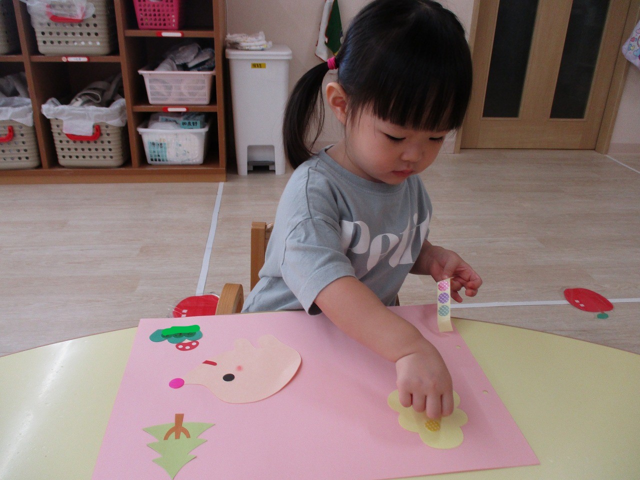 背景の木に、シール貼りをして
