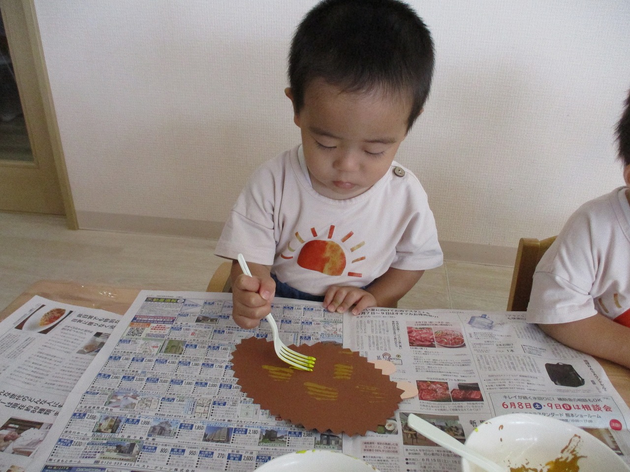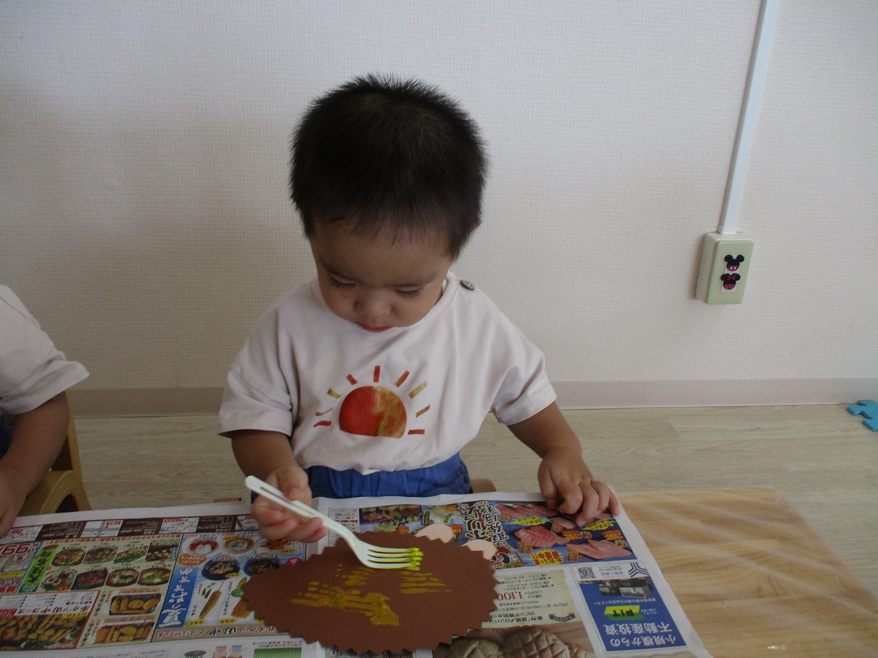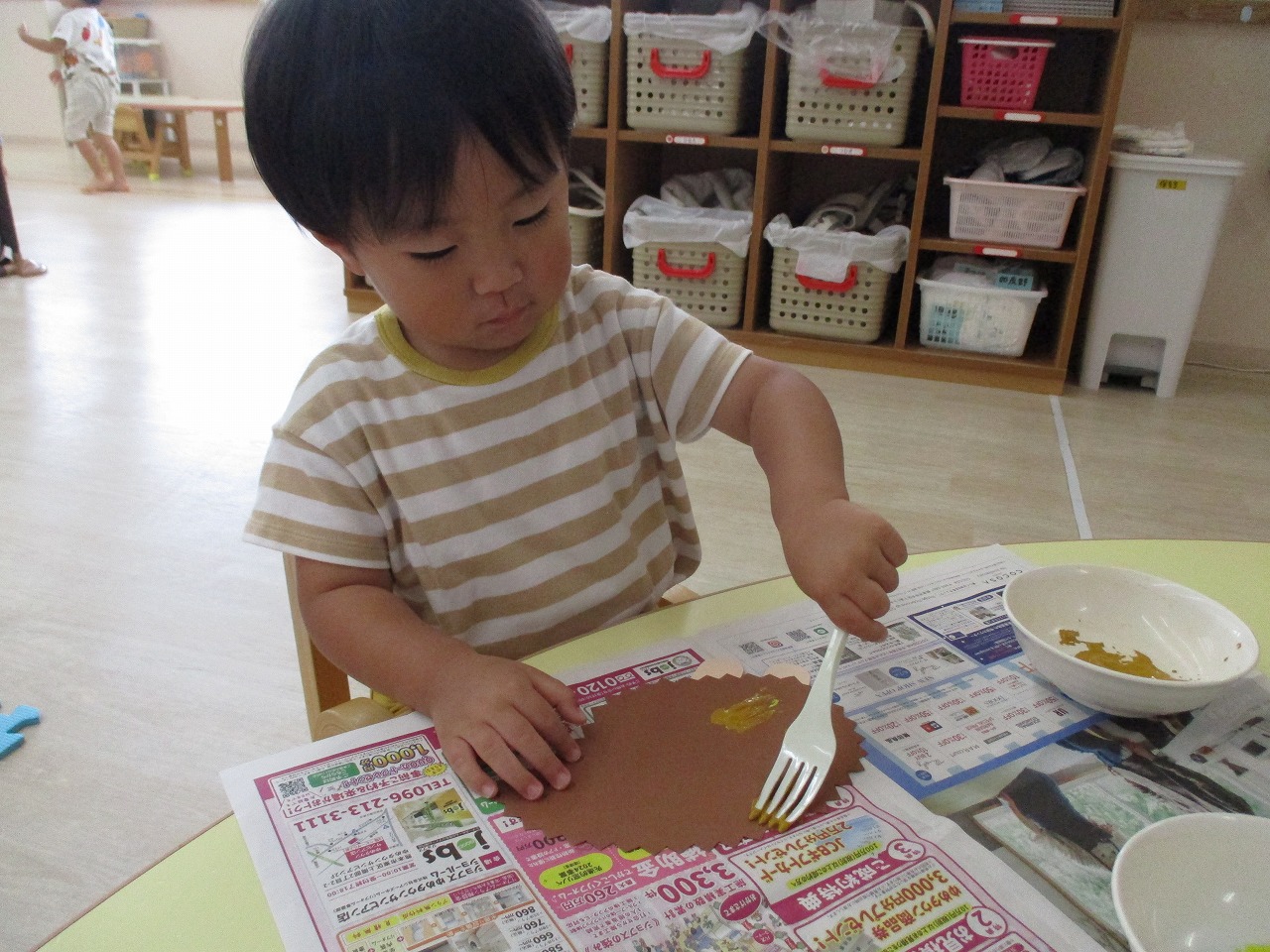 初めてフォークを使った制作に、興味を示して取り組む姿や
