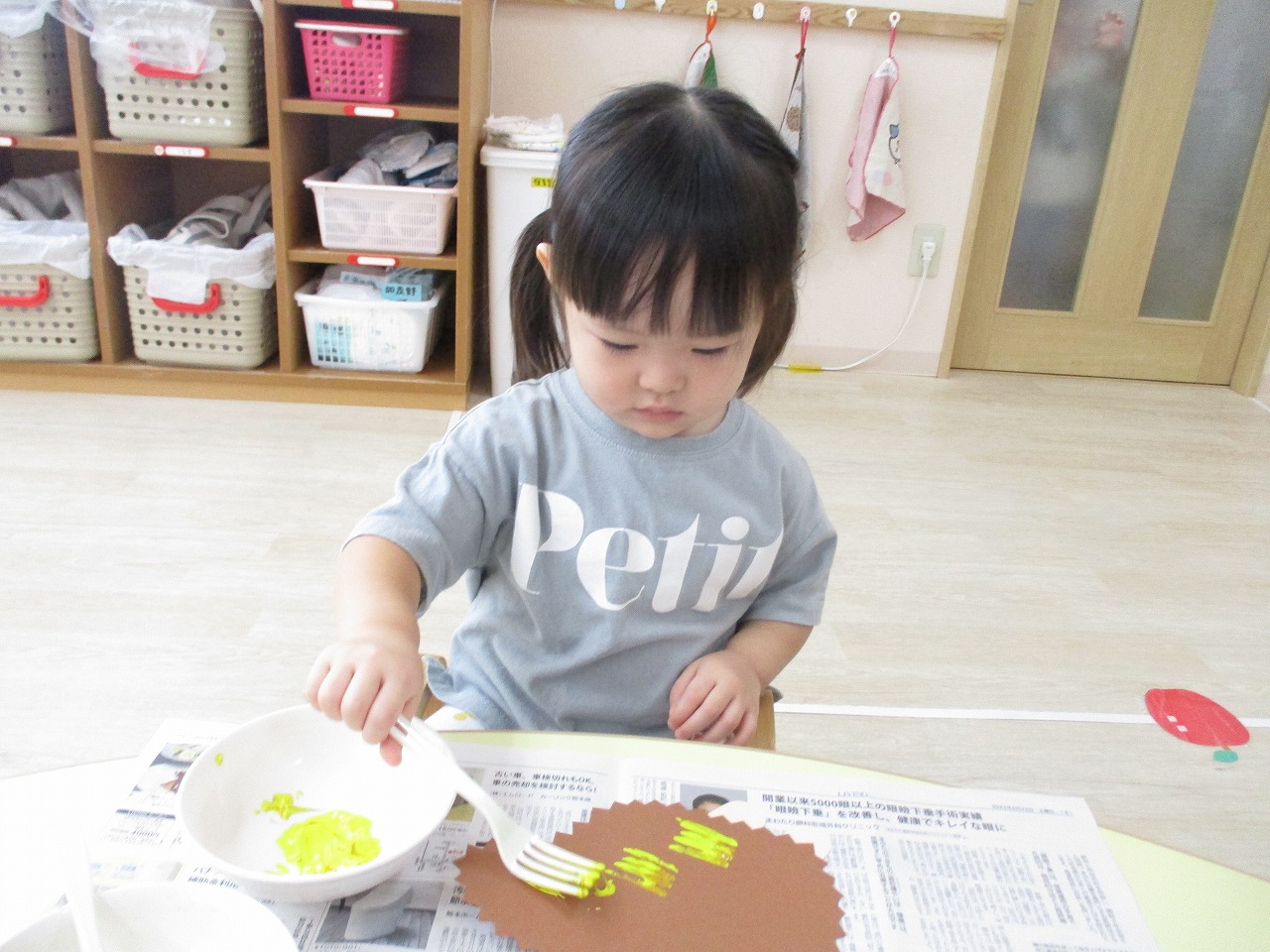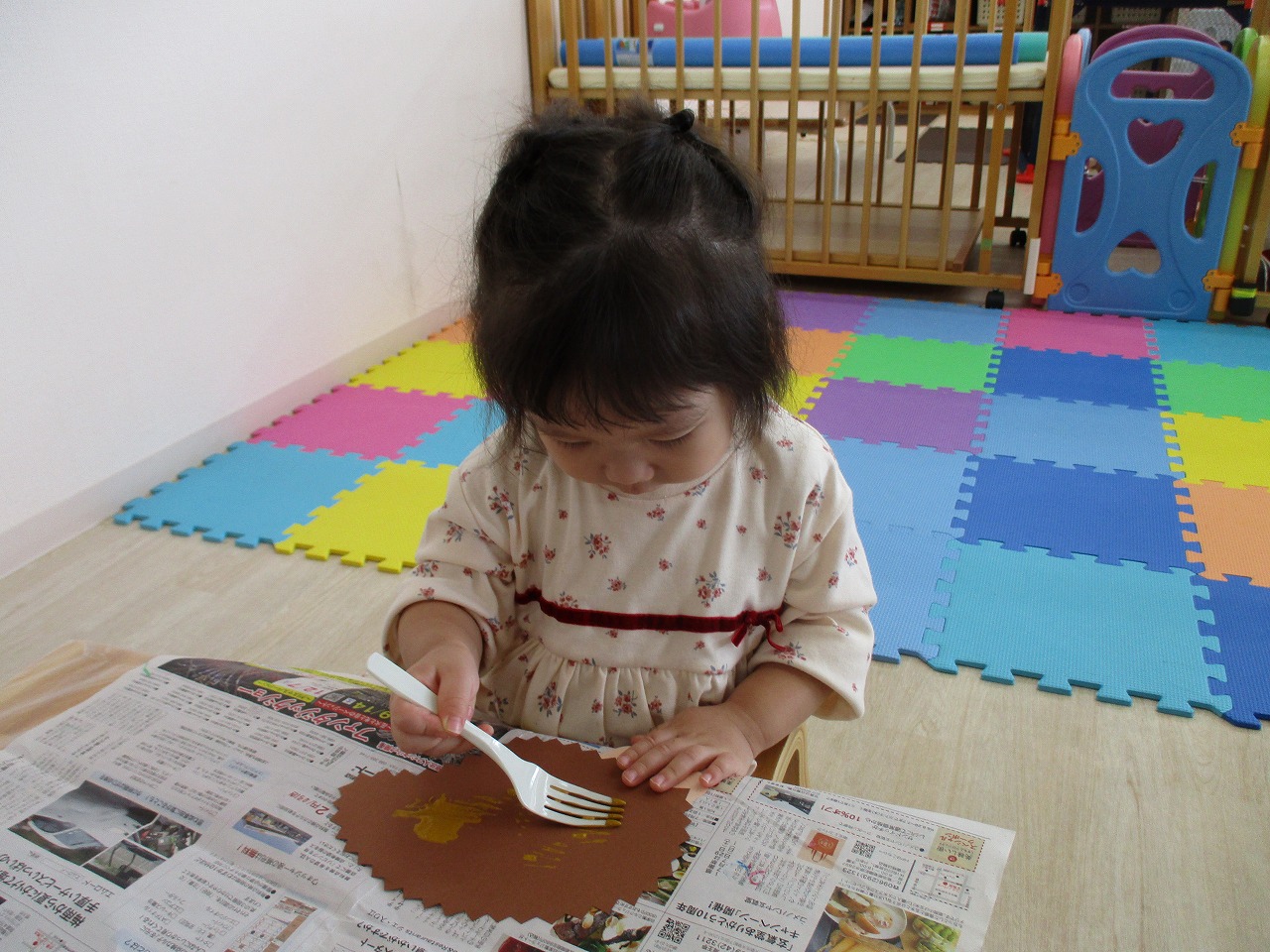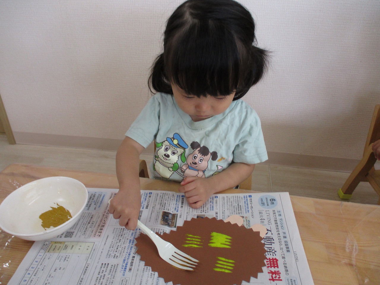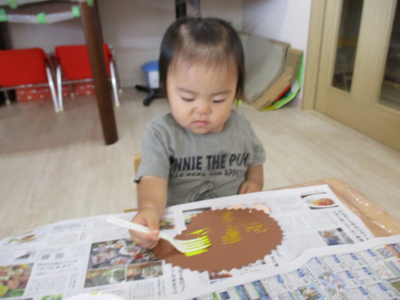 初めてフォークを使った制作に、興味を示して取り組む姿や